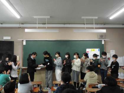 宿題を忘れずに頑張ったことをほめてもらっています。みんなよく頑張ったね。