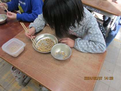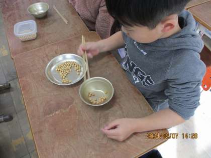 今日はお箸の持ち方を勉強し、豆つまみをしました。