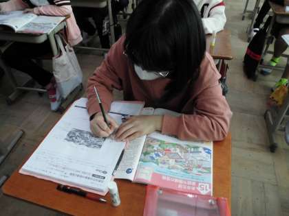 「あなたは家庭や地域の宝物」の学習です。イラストを見て私たちの生活が地域の人々とどのようにかかわっているのかを考え話し合いました。