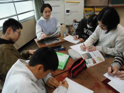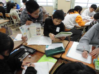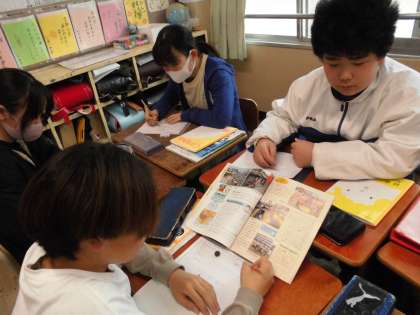 調べた事実と教科書の資料を合わせながらわかりやすく友だちに伝えています。