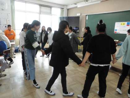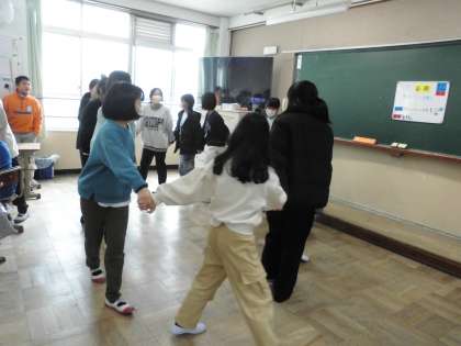 転入生の国の遊びを教えてもらって、みんなで遊んでいます。日本の「かごめかごめ」と似ているようですね。