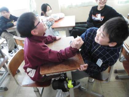 今回は腕相撲大会を開きました。トーナメント表も作ってくれていろいろな友達と対戦を楽しみました。