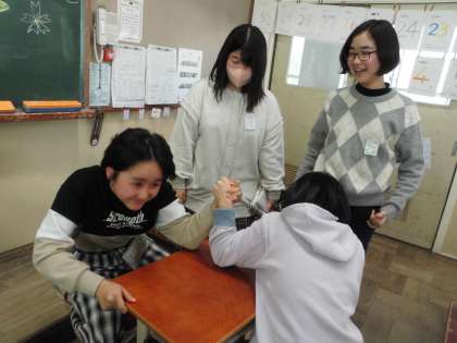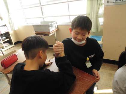 勝っても負けても楽しい腕相撲。友だちを応援する声にも力が入ります。
