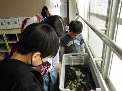 教室の亀を見つめています。餌をあげたり、ひなたぼっこをしているのを見たり…かわいがってくれています。