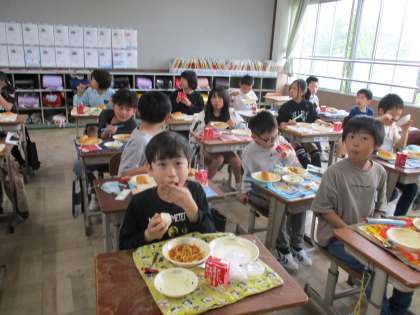 16日より給食がスタートしました。4時間目あたりから、お腹がすいてきた子どもたち。今日の献立の「ミートスパゲッティ」は、みんなの大好きなメニューで、お皿についたソースまできれいに食べていました。