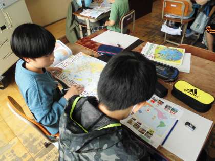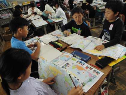 世界地図を広げ、日本の位置や世界の国旗などについて調べました。