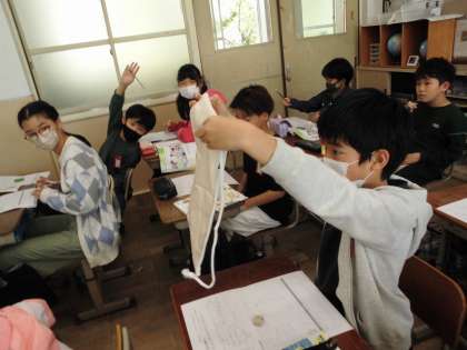 ナップザックのつくりを実物で確かめながら、どこを丈夫に作るとよいのかを考えました。