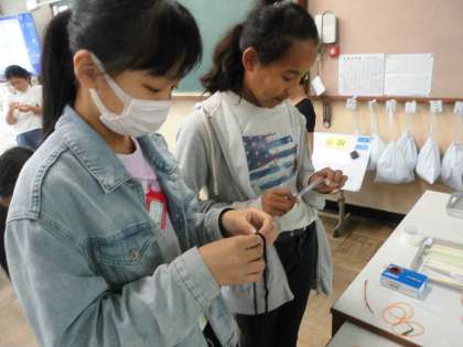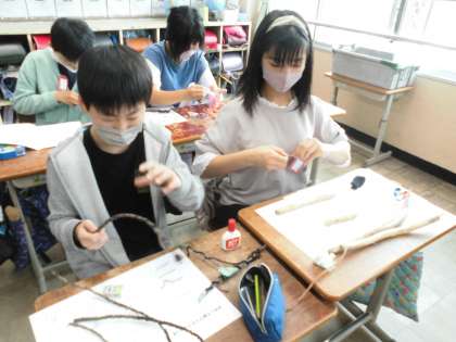 身近にあるもので工夫してオリジナルの「おもしろ筆」を作っています。さてさて、どんな筆が完成するのでしょうか?