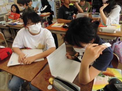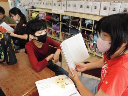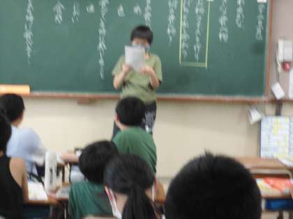 「伝わるかな、好きな食べ物」の学習です。自分の書いた文章を友だちに伝えながらなんの食べ物について書いたものなのかを当て合いました。