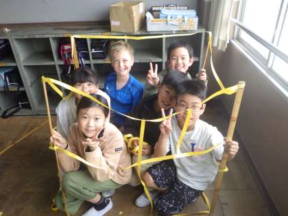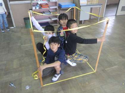 1mものさしと紙テープを使って一辺1mの立方体を作りました。
