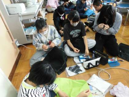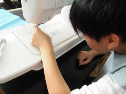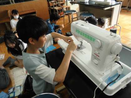 ナップザックを作ります。5年生で学んだ事を確かめ合いながら作っています。