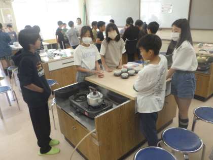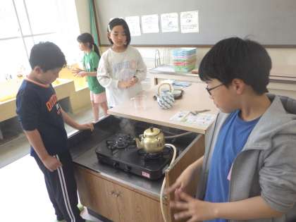 やかんでお湯をわかして、きゅうすでお茶をいれる実習をしました。