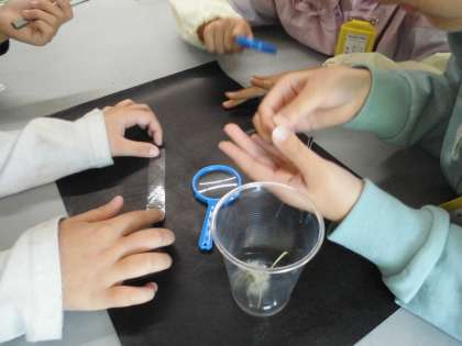 タンポポの花弁を虫メガネで観察しました。