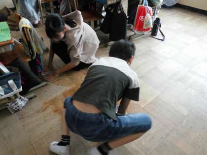 給食時間のひとこまです。すまし汁がこぼれてしまいました。すると、「大丈夫?」の声掛けとともに、素早く動いてふき取ってくれる人がいました。むっちゃ嬉しい!ありがとうね。