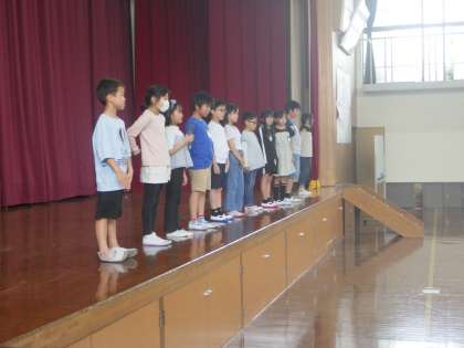 児童集会で、3・4年生の代表委員会の人たちが