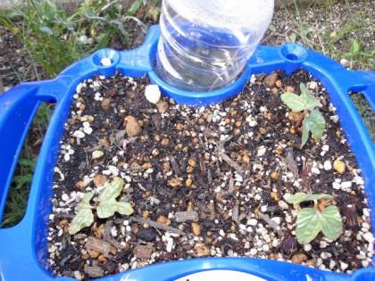 毎日「大きくなあれ」と声をかけながら水やりをしていたので,3つも芽が出てうれしいですね。