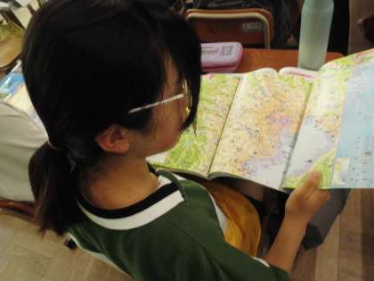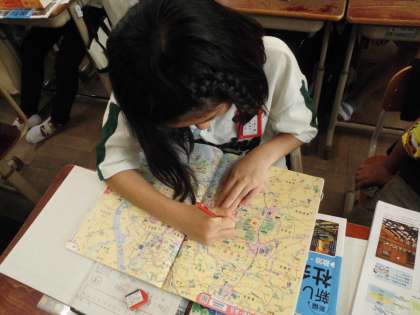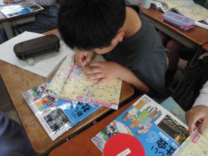 国会のある場所を地図で確かめています。ほかにも最高裁判所を見つけた人や外務省があるよ!等、大切な建物が多く集まっていることに気付いていました。