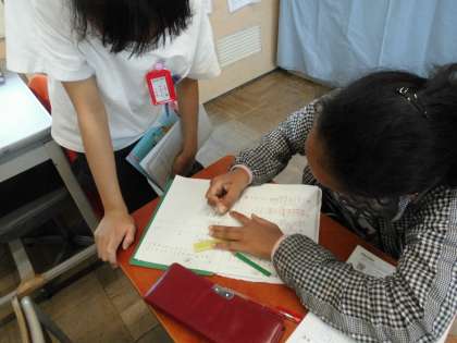 友達同士で考えを伝え合っています。ヒントをもらって、「あ、そうか!」ひらめいたようです。いい姿です。
