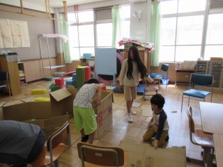 低学年は,段ボールをつなげたりガムテープで飾りをつけたりしていました。