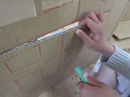 高学年は段ボールカッターを器用に使って窓をくりぬいていました。