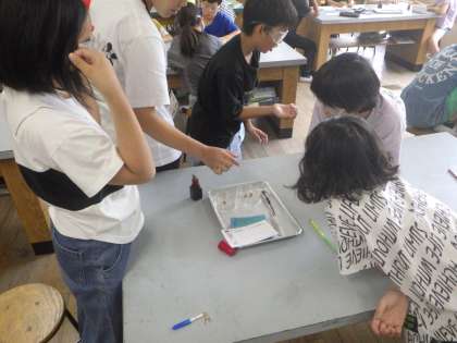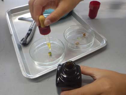 今日は発芽前の種子と発芽後の子葉にヨウ素液をかけて