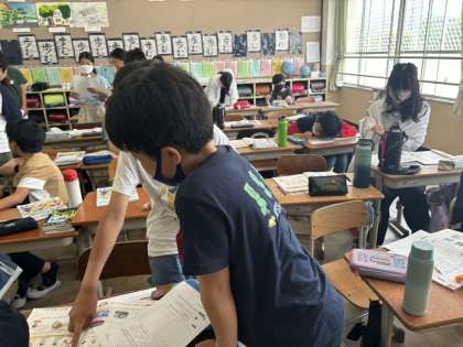 外国語科では、引き続き日本の行事を伝える学習をしています。今回はひとつ日本のモノを選んで実際に紹介し合う活動をしました。「In Japan,〜」といって自分の選んだモノを紹介することができました。