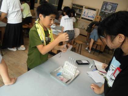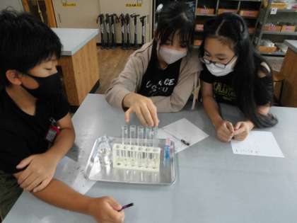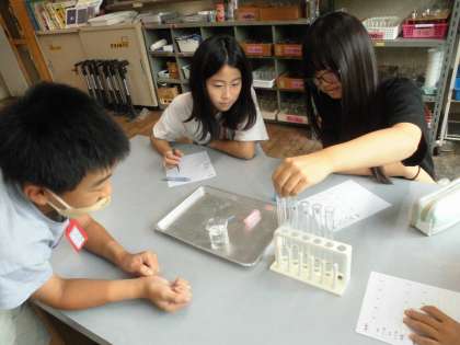 リトマス紙の色の変化にみんな「お〜」「すご〜い」驚きの声が起こっています。