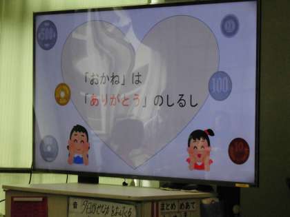 「あまりお金の模様なんて見たことがなかったから、見てみようと思った」とか「クイズが楽しかった」などの感想をもち、少しお金について興味をもてたようでした。今日はみんなが学んだことをおうちでたくさんお話ししてくれると思います。