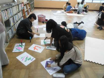 ここは当日、みんなに見えるように掲示するスローガンを作っていました。カラフルでとっても素敵ですね。