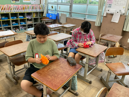 賞状受取の係では、賞状の受け取り方を練習し、その後ゴールアーチに使用するお花を作りました。
