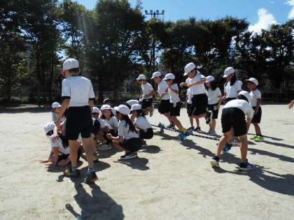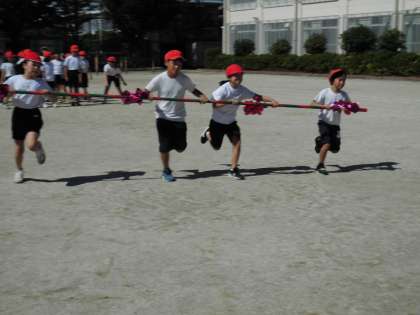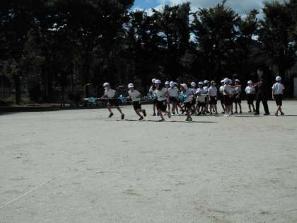 「台風の目」を練習しています。広い運動場で思いっきり走ると気持ちが良かったです。みんなで声を掛け合いながら、随分うまくレース運びができてきました。