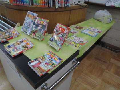 新しい本がカウンター前に並んでいます。読みたい本を見つけてね。