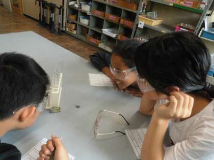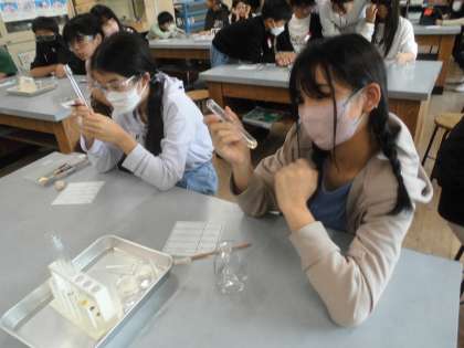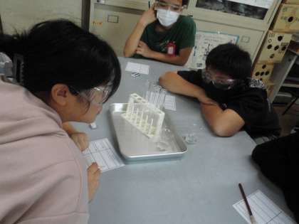 「水よう液と金属」の学習です,塩酸に溶けた金属を蒸発させた後に出てきた固体のに性質を調べる実験をしました。