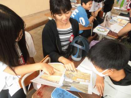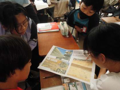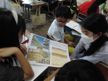 「大地のつくりと変化」の学習です。地層の写真から気が付いたことや考えたことを話し合いました。
