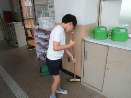 あおぞら学級の廊下の前を丁寧に掃除しています。いつもありがとう!