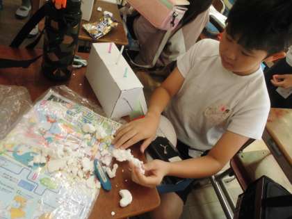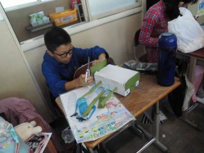 「くるくるクランク」の学習です。材料を工夫して、イメージを膨らませて作っています。むっちゃ頑張ってます。いいね!
