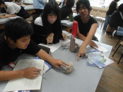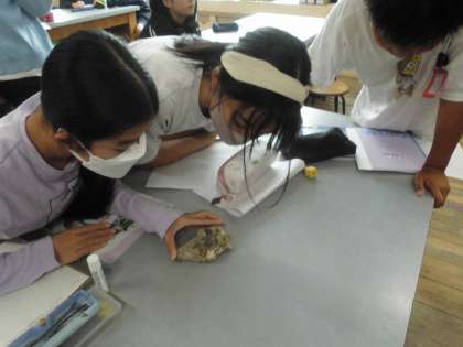 貝や葉の化石のある石の様子を観察しました。