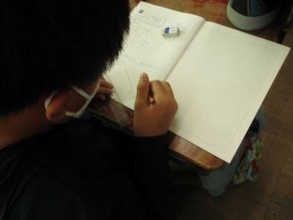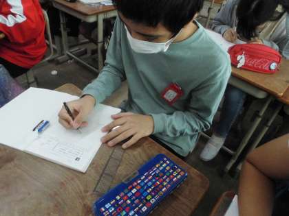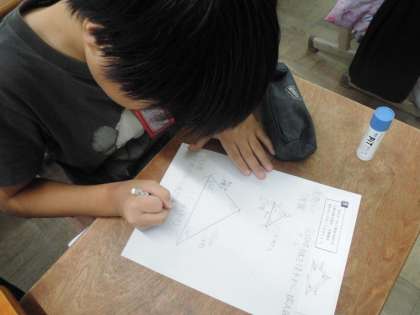 「まずは辺の長さを三倍にして・・・」」「あ、わかった!」コンパスや定規を使ったり、分度器を使ったりして3倍の拡大図を書いています。