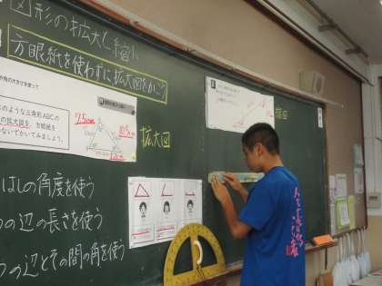 「図形の拡大と縮小」の学習です。今日は縮図をかきました。どうしたらいいのかみんなで考えています。