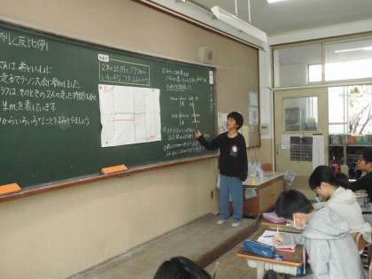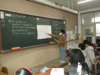 「比例と反比例」の学習です。グラフからいろいろなことをよみ取りました。どのようによみ取ったのかを説明しています。。