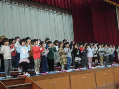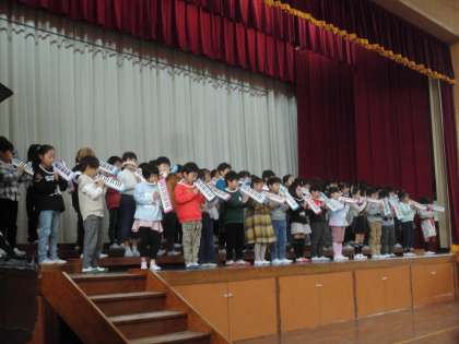 1年生は初めての音楽学習発表会!6年生も曲の紹介を頑張ってくれています。歌も、言葉も、鍵盤ハーモニカも1年生らしく、元気いっぱいに頑張りました。