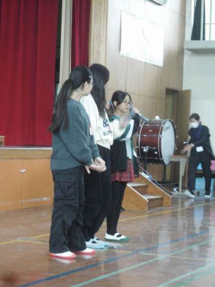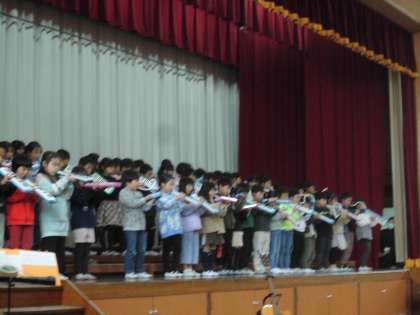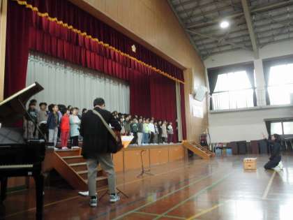曲の紹介をしているのは6年生。2年生は合奏や先生のギターの伴奏に合わせて元気な歌声を聞かせてくれました。