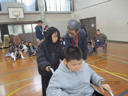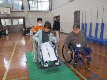車いすに乗るもの押すのも、ほとんどの子にとって初めての体験です。