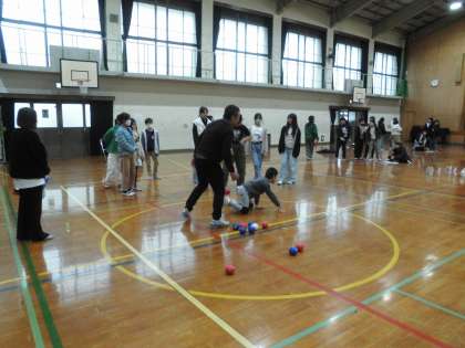 居住地交流がありました。グループに分かれて「モルック」や「「ボッチャ」をして楽しみました。たくさんの笑顔に包まれた時間でした。また、交流したいですね。