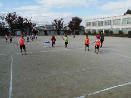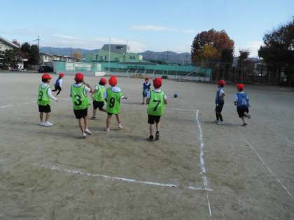 ころころ転がして、ボールあてゲームをしています。ルールが分かり、活発に動けるようになってきました。