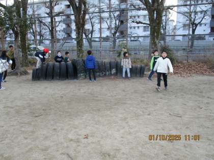 みんなで鬼ごっこです。鬼から逃げてほっとしている様子です。寒さに負けず元気に過ごしていました。