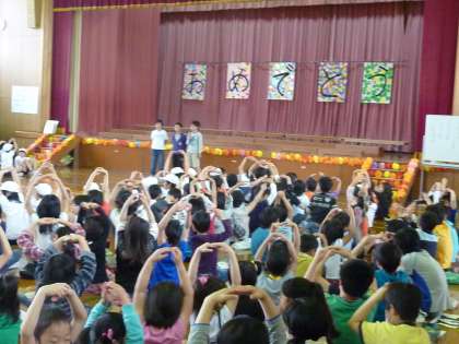 みんなで校歌を歌ったあと,6年生にプレゼントをもらい,手をひかれそれぞれのたてわりグループへ加わりました。その後,学校○×クイズをみんなでしました。6年生がやさしく1年生に教えてあげていました。5年生からの迫力のある応援,そして集団行動には大きな拍手が自然と出ていました。児童会の歌「小さな世界」を歌い,最後に1年生からのお礼がありました。全校みんなでとても楽しい時間を過ごしました。