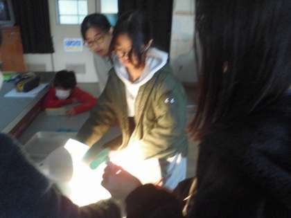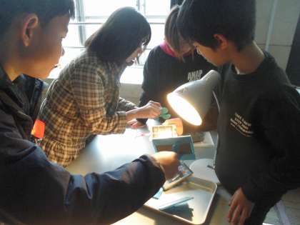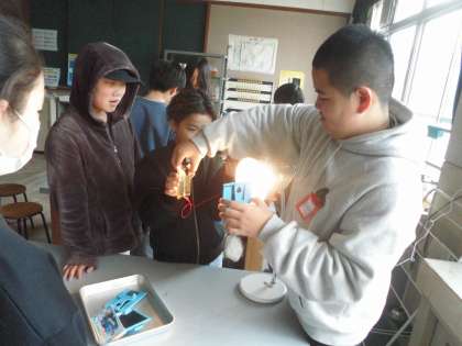 手回し発電機や光電池での発電を確かめる実験をしています。