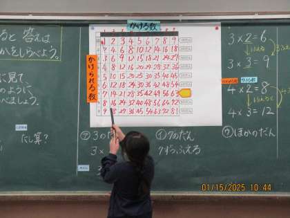 かけざんのきまりの学習をしました。かける数が1ふえるとかけられる数ずつふえることに気付くことができました。