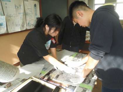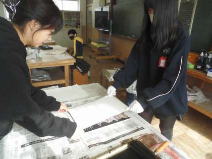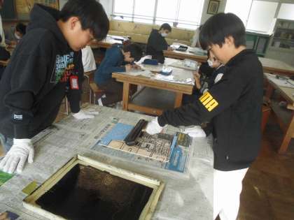 丁寧にインクを付けています。どのように刷り上がるかな?楽しみですね。